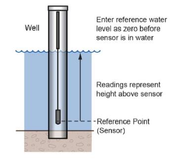 如果使用傳感器作為參考點,如下所示,在HOBOmobile中輸入?yún)⒖妓粸?STRONG>零,并在傳感器處于水中之啟動記錄儀。 記錄的水位讀數(shù)將代表傳感器上方的高度。