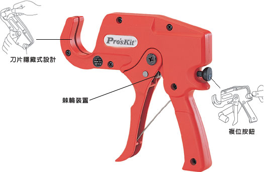 8PK-SR010, 省力型PVC切管鉗(6mm~35mm) [電工剪鉗類]. 全長: 190mm. 隱藏式刀片設(shè)計(jì), 確保使用者安全. 內(nèi)建式棘輪裝置, 操作輕松、省力. 剪切范圍: 外徑6mm ~ 35mm