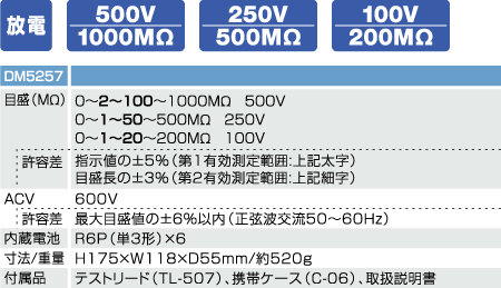 本器は定格電圧500V、250V、100Vの印加電圧3レンジ式の絶縁抵抗計です。パワーオンとパワーロックが可能な2段式プッシュスイッチを採用。測定後、充電された電圧を放電するディスチャージ機(jī)能付きです。內(nèi)蔵電池の電池容量が簡単に測れるインナーバッテリチェック機(jī)能を搭載しました。