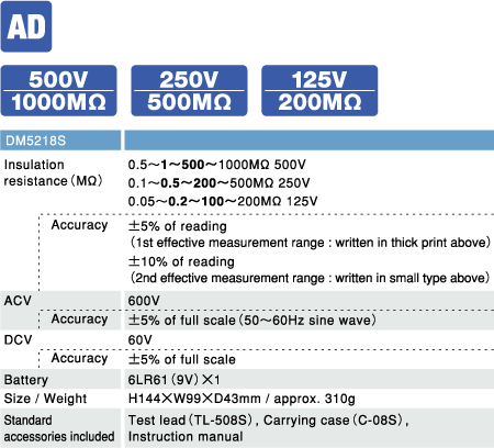 500V/1000MΩ,250V/500MΩ,125V/200MΩ