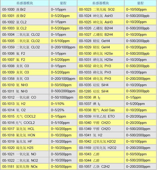 PortaSens II 檢測儀是一種電池供電,能在空氣中檢測多種有毒氣體的便攜儀器。檢測儀每次只檢測一種氣體,但可及時替換多達40多種氣體的傳感器對相應氣體實施檢測。以下表格列出了當前可供選擇的傳感器模塊及其所覆蓋的量程,注意:該檢測儀可根據用戶要求在模塊提示的最小和最大量程之間進行相應調整,如:把一個號碼為00-1010NH3傳感器模塊插入檢測儀內,量程可在0-50PPM0-500PPM之間設置。葉就是每個模塊均為雙量程設置。