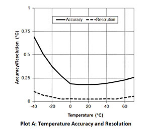范圍: -20°C至70°C(-4°至158°F)精度: ±0.21°C從0°到50°C(±0.38°F 32°至122°F),Plot A (A圖)