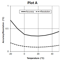 精度:± 0.44 °C從0 °到50°C ( ± 0.79 °F從32 °到122°F ) ,見(jiàn)下圖plotA