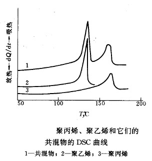 例如脆性的聚丙烯往往與聚乙烯共混或共聚增加它的柔性。關(guān)于聚丙烯和聚乙烯共混物的成分可分別根據(jù)它們的熔融峰面積計(jì)算,因?yàn)樵诠不煳镏兴鼈兏髯员3直旧淼娜廴谔匦,如下圖所示。