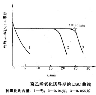 為了防止高聚物的氧化降解作用,通常在高聚物中添加少量的抗氧化劑。至于用什么方法來(lái)評(píng)價(jià)抗氧化劑的效力是人們關(guān)注的問(wèn)題。目前普遍采用的方法是利用DSC DTA 測(cè)定高聚物的氧化誘導(dǎo)期。例如對(duì)具有不同含量抗氧化劑的聚乙烯在200 ℃ 和氧氣下進(jìn)行測(cè)定,所測(cè)得的氧化誘導(dǎo)期是隨著抗氧化劑含量的增大而延長(zhǎng)的,如下圖所示。