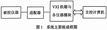由圖1可見,它由四大部分組成,分別是:①VXI機箱及各儀器模塊,主要作為校準(zhǔn)時的標(biāo)準(zhǔn)儀器,包括函數(shù)信號和RF信號發(fā)生器、通用計數(shù)器、數(shù)字多用表、示波器、接收機以及射頻開關(guān)模塊:②主控計算機,用于系統(tǒng)協(xié)調(diào)控制與數(shù)據(jù)處理:③適配器,用于實現(xiàn)被校儀器與該系統(tǒng)的連接、阻抗匹配變換、信號衰減等功能,同時提供穩(wěn)定可靠、頻率和電壓分段可調(diào)的1mV~300V交、直流電壓。④被校的各種儀器。本校準(zhǔn)系統(tǒng)具體可對六大類儀器的58項參數(shù)進行校準(zhǔn),其中對頻率計類儀器校準(zhǔn)的參數(shù)分別是:測頻率、周期、比率、靈敏度、時間間隔以及頻率穩(wěn)定度。